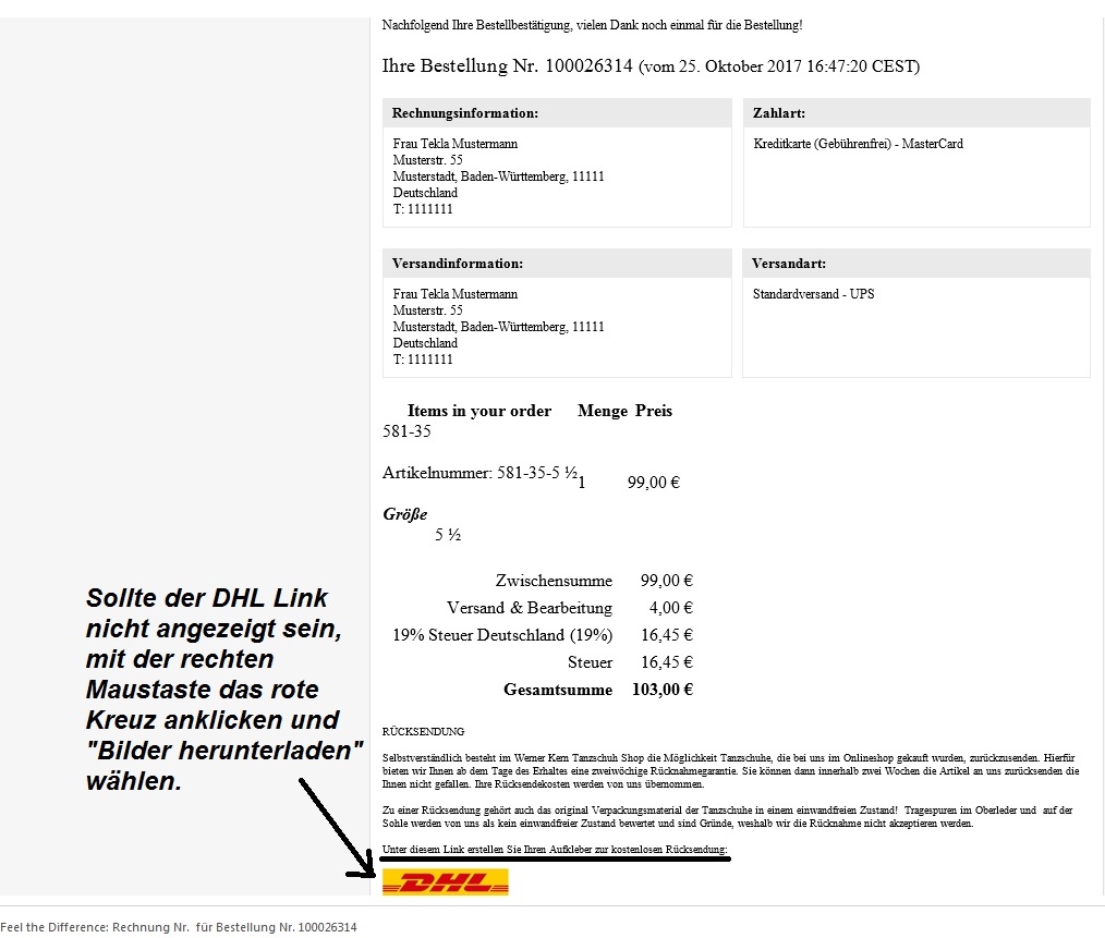 In Ihrer Bestellbestätigung, die Sie per E-Mail am Tag Ihrer Bestellung erhalten haben, befindet sich ein DHL Link zu Ihrem Aufkleber für die kostenlose Rücksendung. Sollten Sie diese E-Mail nicht mehr haben, schicken wir Ihnen auf Wunsch diesen Link sehr gerne zu. In dem folgenden Bild sehen Sie, wo sich der DHL Link in Ihre Bestellung befindet: